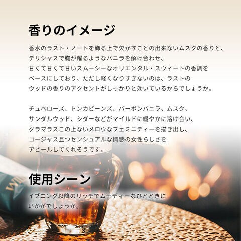 香水のラスト・ノートを飾る上で欠かすことの出来ないムスクの香りと、デリシャスで胸が躍るようなバニラを解け合わせ、甘くて甘くて甘いスムーシーなオリエンタル・スウィートの香調をベースにしており、ただし軽くなりすぎないのは、ラストのウッドの香りのアクセントがしっかりと効いているからでしょうか。チュベローズ、トンカビーンズ、バーボン・バニラ、ムスク、サンダルウッド、シダーなどがマイルドに緩やかに溶け合い、グラマラスこの上ないメロウなフェミニティーを描き出し、ゴージャス且つセンシュアルな情感の女性らしさをアピールしてくれそうです。
