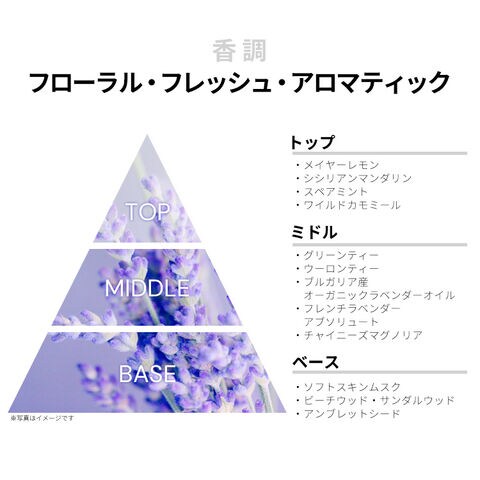 メイヤー・レモン、シシリアン・マンダリン、スペアミント、ワイルド・カモミールなどが、ルミナスフルで胸躍るようなシトラス・フレッシュを香り立たせるトップから、