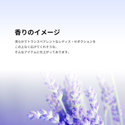 ほがらかでリラクゼーションあふれるフローラル・フレッシュ・アロマティックな香調をベースにしていて、清らかでトランスペアレントなレディス・セダクションをこの上なく広げてくれそうな、そんなアイテムに仕上がっております。