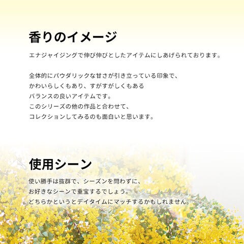 イエロー・フローラルのミモザをフィーチャーしたこの作品は、シトラス・フローラルのさっぱりとした香調がベース。エナジャイジングで伸び伸びとしたアイテムにしあげられております。