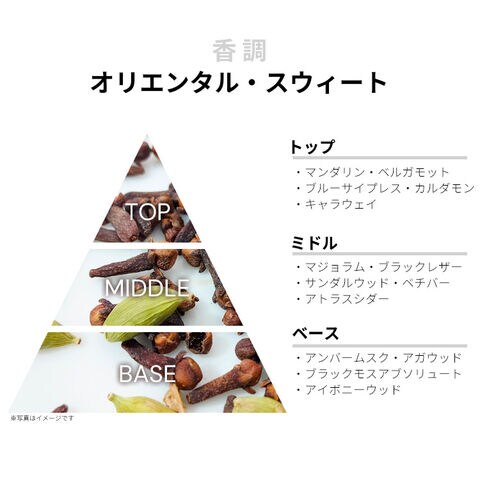 マンダリン、ベルガモット、ブルー・サイプレス、カルダモン、キャラウェイなどが、トップから攻めのシトラス・スパイシーをスプラッシュさせ、
