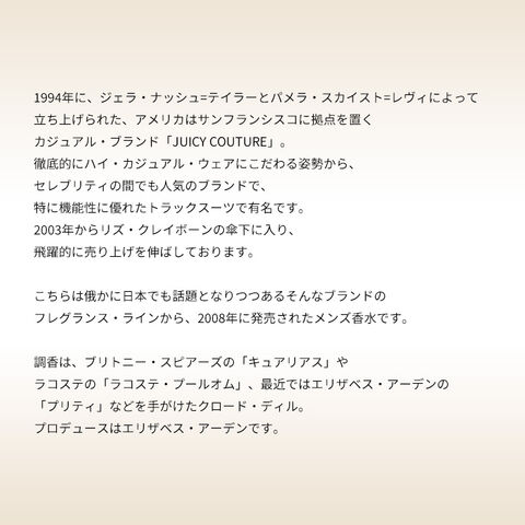 まったりとしたムードにベストマッチしそうですが、イブニング以降のプライヴェートなシーンであれば、意外とどんな場面でもお使いいただけると思います。ちょっとキケンなマスキュリンを演出したいときにもオススメです。ブランドのロゴが男らしく映えるボトル&パッケージもそうですが、琥珀の香水色も秀逸です。
