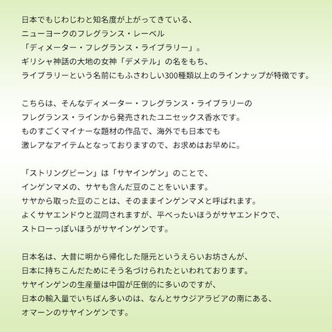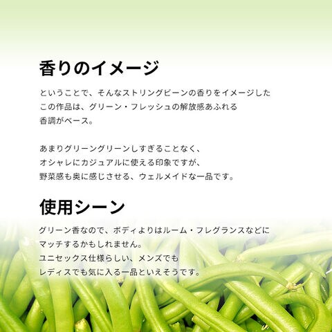 ということで、そんなストリングビーンの香りをイメージしたこの作品は、グリーン・フレッシュの解放感あふれる香調がベース。