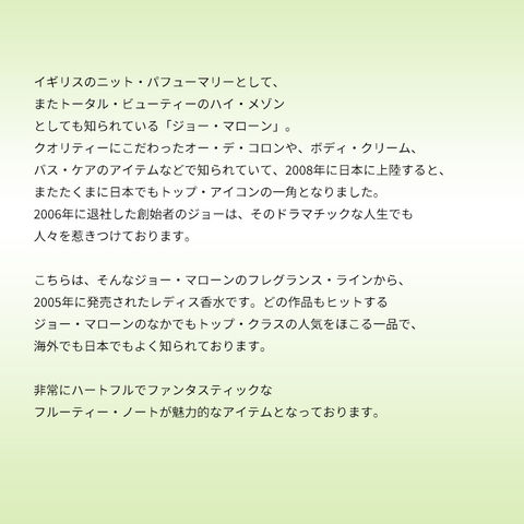 こちらは、そんなジョー・マローンのフレグランス・ラインから、2005年に発売されたレディス香水です。どの作品もヒットするジョー・マローンのなかでもトップ・クラスの人気をほこる一品で、海外でも日本でもよく知られております。