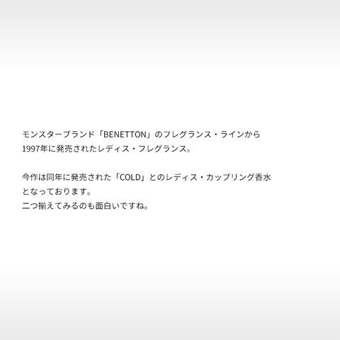モンスターブランド「BENETTON」のフレグランス・ラインから1997年に発売されたレディス・フレグランス。パッケージやボトルがオシャレで目を惹きますね。ボトルの噴出部分は、蛇口をイメージしているのだそうです。シトラス・フローラル・ムスキーのややまったりとした香りで、HOTというよりも暖かい印象に仕上がっております。