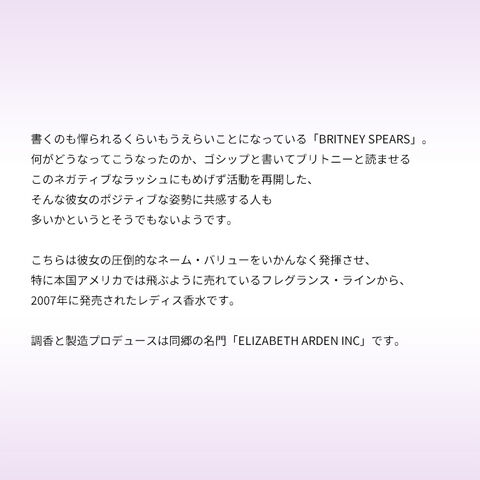 こちらは彼女の圧倒的なネーム・バリューをいかんなく発揮させ、特に本国アメリカでは飛ぶように売れているフレグランス・ラインから、2007年に発売されたレディス香水です。このラインの特徴であるエロいニュアンスは今回も健在で、オリエンタル・ウッディーのメロウなスウィートをベースに、まさにナイト・シーンをエロっと演出するようなアイテムに仕上げられております。