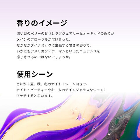 とにかく夏、秋、冬のナイト・シーン向きで、ナイト・パーティーやお二人のデインジャラスなシーンにマッチすると思います。ボトルは、デザイン自体はどこか別のブランドのボトルで似たようなものがありましたが、カラーがとても美しいと思います。