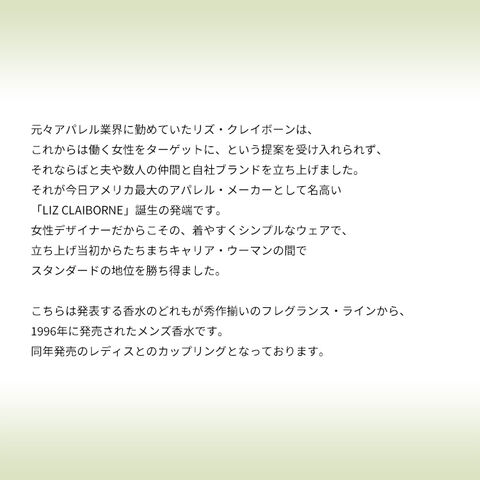 こちらは発表する香水のどれもが秀作揃いのフレグランス・ラインから、1996年に発売されたメンズ香水です。同年発売のレディスとのカップリングとなっております。カーヴというネーミングだけあって、ちょっと捻りの効いたユニークなシトラス・グリーン・ウッディーの香調に仕上がっており、モダンなマテリアルを巧みにブレンドした、一筋縄ではいかない香り作りは、他のリズ香水の例に漏れません。グリーン・リーフ、ラベンダー、ダグラス・ファー(米松)、ジュニパー・ベリーなどが、キリッとハイエッジ且つライトなアロマティック・ウッディー・グリーンを香り立たせるトップから、ベルガモット、チャイナ・ジンセン(朝鮮人参)、カルダモン、リビング・カクタス(サボテン)などが、ビターでユニークなスパイシー・フレッシュを沸き立たせるミドルへ。ラストはサンダルウッド、マホガニー・ウッド、ブラックペッパー、アンバー、ベチバーなどが、ウッドのウォームな香りをメインにした、とことん深みのあるマスキュリン・スウィートを湛え、ほっと安らげるような雰囲気の大人の包容力のようなものを垣間見させてくれそうです。