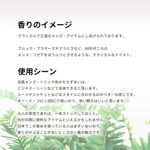 ブルック・ブラザーズやアラミスなど、60年代ころのメンズ・フゼアをほうふつとさせるような、クラシカルなテイストで、高級メンズ・トニック系のたたずまいは、ビジネス・シーンなどで活用できると思います。スーツやジャケットなどのスタイルに合わせるのがベターな感じです。オー・ド・コロン(EDC)で軽いので、使い勝手はいいと思います。