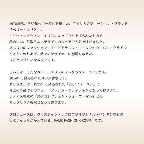 こちらは、そんなペリー・エリスのフレグランス・ラインから、2014年に発売されたメンズ香水です。オリジナルは、1995年に発売された「360°フォーメン」で、今回の作品はそのニュー・アレンジ・エディションとなっております。レディス香水の「360°コレクション・フォーウーマン」とのカップリング香水となっております。
