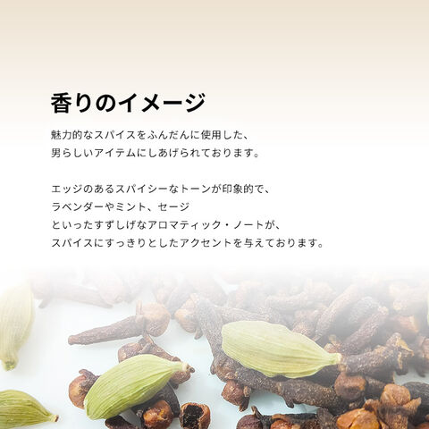 香りは、キリッとシャープでエキゾチックな、アロマティック・スパイシーの香調がベース。魅力的なスパイスをふんだんに使用した、男らしいアイテムにしあげられております。