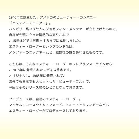 プロデュースは、自社のエスティー・ローダー。マイケル・コースやトム・フォード、トミー・ヒルフィガーなどもエスティー・ローダーがプロデュースしております。