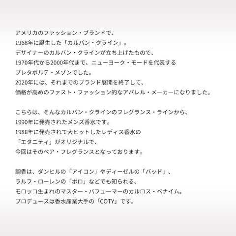 1988年に発売されて大ヒットしたレディス香水の「エタニティ」がオリジナルで、今回はそのペア・フレグランスとなっております。