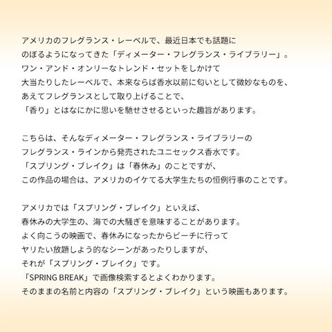 メンズの化粧品にありそうな、ココナッツ&クール・スウィートなトーンで、フレグランスというよりはボディ・ローションなどに近いかもしれません。いずれにせよ、春よりはサマーシーズンにベストマッチすると思います。