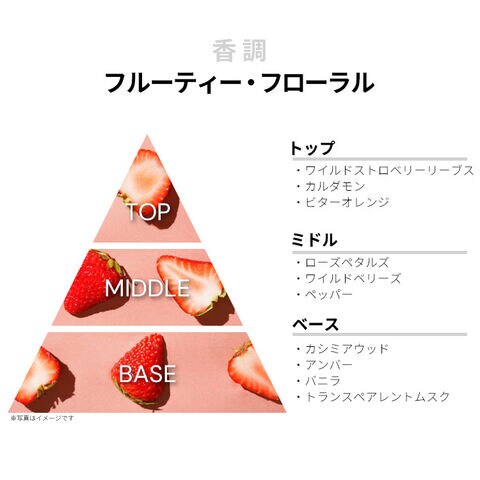 アプリコット、ベルガモット、オレンジ・ブロッサム、グリーン・ノート、ローズウッドなどが、伸びのあるフルーティー・グリーンを香り立たせるトップから、