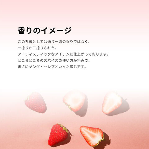 ラストはシベット、ホワイト・ムスク、オークモス、アンバー、サンダルウッド、ベチバー、シダーウッドなどが、ホットなムスキー・ウッディー・スウィートを香らせて、グラマラスなセンシュアリティーをアピールしてくれそうです。