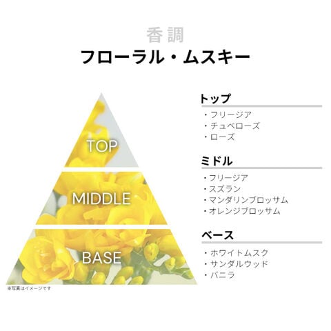 フリージア、チュベローズ、ローズなどが、凛としたフローラル・フレッシュを香り立たせるトップから、