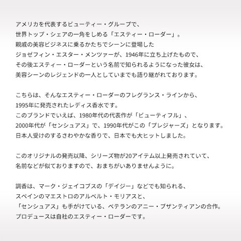 このブランドでいえば、1980年代の代表作が「ビューティフル」、2000年代が「センシュアス」で、1990年代がこの「プレジャーズ」となります。日本人受けのするさわやかな香りで、日本でも大ヒットしました。