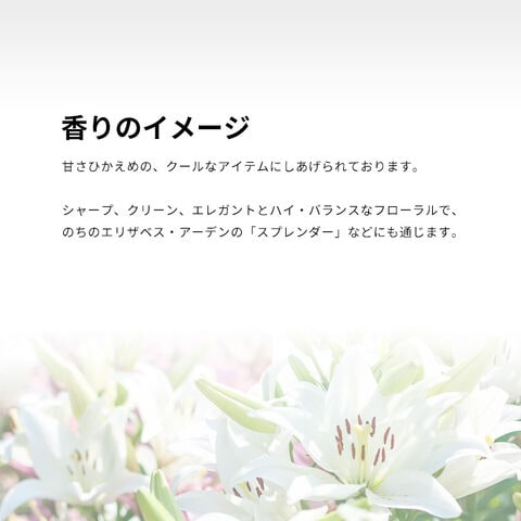 シャープ、クリーン、エレガントとハイ・バランスなフローラルで、のちのエリザベス・アーデンの「スプレンダー」などにも通じます。