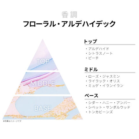 アルデハイド、シトラスノート、ピーチなどがふんわりとテンダーに浮かび上がるトップから、ローズ、ジャスミン、ライラック、オリス、ミュゲ、イランイランなどが、まさにフローラルの王道を行く上質でエレガントなブーケを創り上げるミドルへ。ラストはシダー、ハニー、アンバー、シベット、サンダルウッド、トンカビーンズなどが、グラマラスでラグジュアリーなスウィートを淡く漂わせ、上品で繊細な佇まいの貴女の女性らしい美しさをさりげなくアピールしてくれることでしょう。