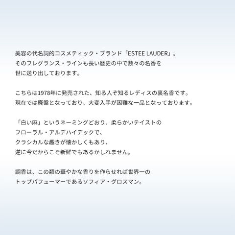 美容の代名詞的コスメティック・ブランド「ESTEE LAUDER」。そのフレグランス・ラインも長い歴史の中で数々の名香を世に送り出しております。こちらは1978年に発売された、知る人ぞ知るレディスの裏名香です。現在では廃盤となっており、大変入手が困難な一品となっております。「白い麻」というネーミングどおり、柔らかいテイストのフローラル・アルデハイデックで、クラシカルな趣きが懐かしくもあり、逆に今だからこそ新鮮でもあるかしれません。