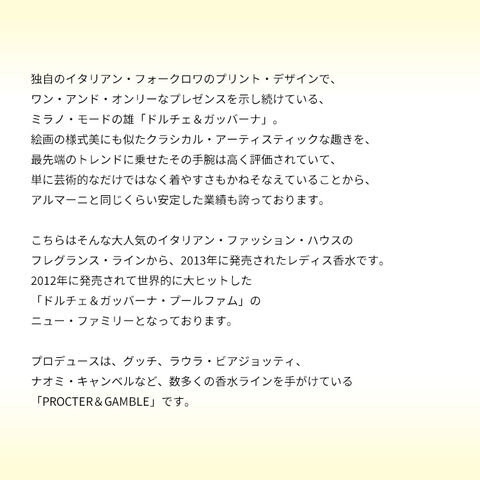 こちらはそんな大人気のイタリアン・ファッション・ハウスのフレグランス・ラインから、2013年に発売されたレディス香水です。2012年に発売されて世界的に大ヒットした「ドルチェ&ガッバーナ・プールファム」のニュー・ファミリーとなっております。オリジナルのインテンス(濃い)エディションということで、基本的なトーンはフローラル・グルマンで変わりありませんが、マテリアルを少し変えて、パウダリック・スウィートがより強調されたような一品に仕上がっております。