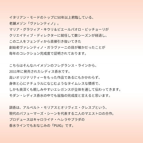 調香は、アルベルト・モリアスとオリヴィエ・クレスプという、現代のパフューマーズ・シーンを代表する二人のマエストロの合作。プロデュースはキャロライナ・ヘレラやプラダの香水ラインでもおなじみの「PUIG」です。ミドルのジャスミンとストロベリーの香りが印象的で、香りようではフルーティー・フローラル調にも感じられるかもしれませんが、基本的にはソーピーなフローラルとバニラが引き立った香りです。