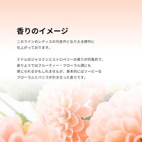 ラストはシダーウッド、バニラ、アンバーなどが、穏やかなスウィートで全体をまとめ上げて、たおやかなレディス・センシュアリティーをアピールしてくれそうです。