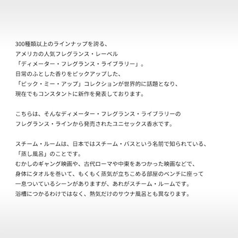 さてそんなスチーム・ルームの香りは、オーガニックなトーンのハーバル・ウッディーの香調がベース。