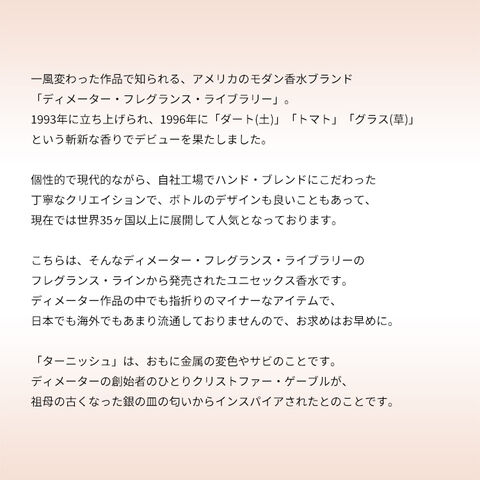 「ターニッシュ」は、おもに金属の変色やサビのことです。ディメーターの創始者のひとりクリストファー・ゲーブルが、祖母の古くなった銀の皿の匂いからインスパイアされたとのことです。