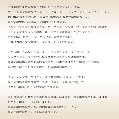 レザーの香りという意味では、ほかにも「レザー」や「ロシアン・レザー」といった作品もありますので、香りをくらべてみるのもおもしろいと思います。