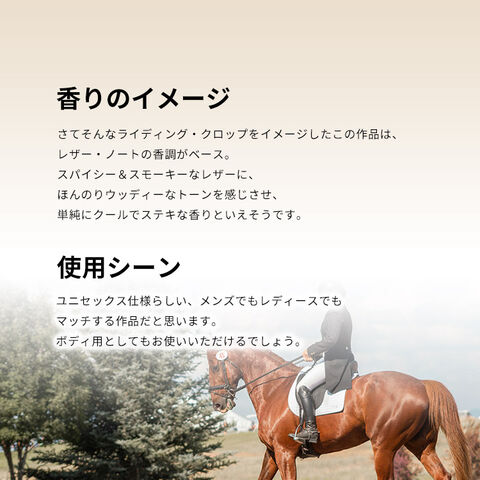 さてそんなライディング・クロップをイメージしたこの作品は、レザー・ノートの香調がベース。スパイシー&スモーキーなレザーに、ほんのりウッディーなトーンを感じさせ、単純にクールでステキな香りといえそうです。