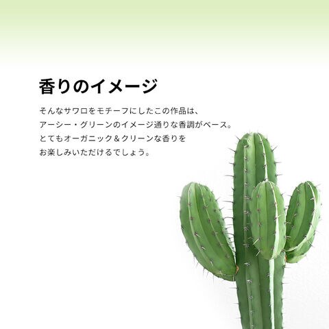そんなサワロをモチーフにしたこの作品は、アーシー・グリーンのイメージ通りな香調がベース。とてもオーガニック&クリーンな香りをお楽しみいただけるでしょう。おなじサボテンをモチーフにした「プリックリー・ペア」と香りをくらべてみるのも、また一興だと思います。