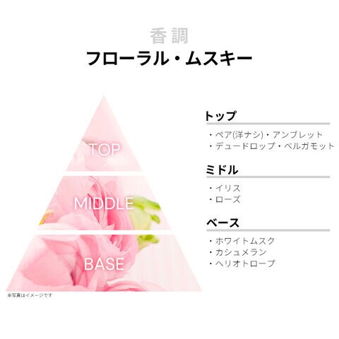 ペア(洋ナシ)、アンブレット、デュー・ドロップ、ベルガモットなどが、シアーでこころよいフルーティー・アロマを香り立たせるトップから、