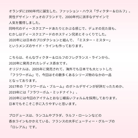 こちらは、そんなヴィクター&ロルフのフレグランス・ラインから、2020年に発売されたレディス香水です。オリジナルは、2005年に発売されて、海外でも日本でも大ヒットした「フラワーボム」で、今回はその数多くあるシリーズ物のなかの一品となっております。