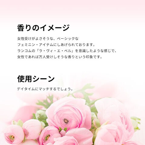 ランコムの「ラ・ヴィ・エ・ベル」を意識したような感じで、女性であれば万人受けしそうな香りという印象です。デイタイムにマッチするでしょう。