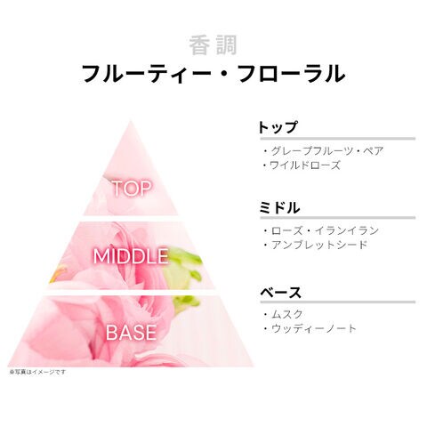 グレープフルーツ、ペア、ワイルド・ローズなどが、ポップでチャーミングなフルーティー・フレッシュを香り立たせるトップから、