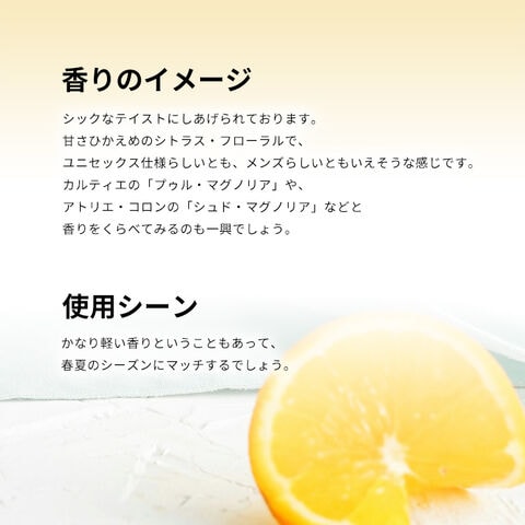 レモン、グレープフルーツ、ベルガモット、シトラル、リモネンなどが、シャープなシトラス・ノートを香り立たせるトップから、