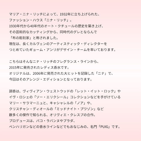 こちらはそんなニナ・リッチのフレグランス・ラインから、2015年に発売されたレディス香水です。オリジナルは、2006年に発売された大ヒットを記録した「ニナ」で、今回はそのアレンジ・エディションとなっております。香りは、ポップでデリシャスフルなフルーティー・フローラル・グルマンの香調がベース。ジョイフルでキュートなフェミニンを描き出した一品にしあがっております。