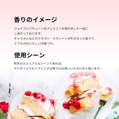 調香は、ヴィヴィアン・ウェストウッドの「レット・イット・ロック」やイヴ・ロシェの「ソー・エリクシール」コレクションなどを手がけているマリー・サラマーニュと、キャシャレルの「ノア」や、クリスチャン・ディオールの「ミッドナイト・プワゾン」など数多くの傑作で知られる、オリヴィエ・クレスプの合作。プロデュースは、パコ・ラバンヌやプラダ、ペンハリガンなどの香水ラインなどでもおなじみの、名門「PUIG」です。キャラメルなどのグルマン・スウィートが引き立った香りで、とてもかわいらしい印象です。秋冬のカジュアルなシーンであれば、デイタイムでもイブニング以降でもお使いいただけると思います。