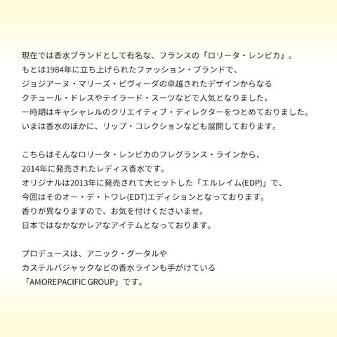 こちらはそんなロリータ・レンピカのフレグランス・ラインから、2014年に発売されたレディス香水です。オリジナルは2013年に発売されて大ヒットした「エルレイム(EDP)」で、今回はそのオー・デ・トワレ(EDT)エディションとなっております。香りが異なりますので、お気を付けくださいませ。日本ではなかなかレアなアイテムとなっております。
