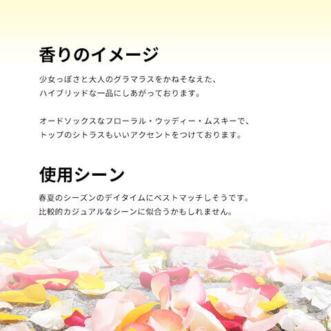 香りは、ロマンチックでわかわかしいフローラル・ウッディー・ムスキーの香調がベース。少女っぽさと大人のグラマラスをかねそなえた、ハイブリッドな一品にしあがっております。
