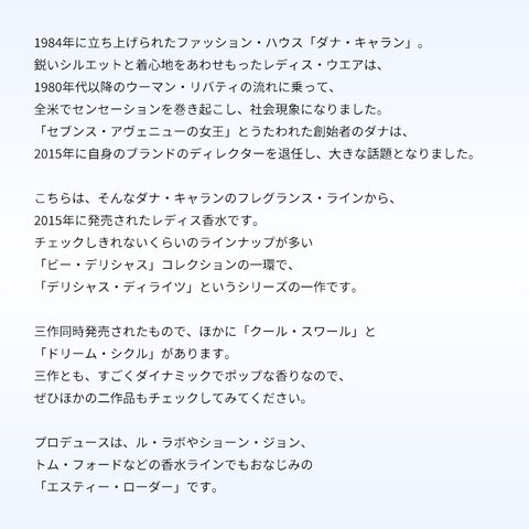 こちらは、そんなダナ・キャランのフレグランス・ラインから、2015年に発売されたレディス香水です。チェックしきれないくらいのラインナップが多い「ビー・デリシャス」コレクションの一環で、「デリシャス・ディライツ」というシリーズの一作です。