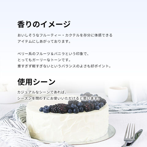 ベリー系のフルーツ&バニラという印象で、とってもガーリーなトーンです。重すぎず軽すぎないというバランスのよさも好ポイント。カジュアルなシーンであれば、シーズンを問わすにお使いいただけると思います。