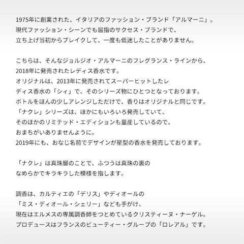 オリジナルは、2013年に発売されてスーパーヒットしたレディス香水の「シィ」で、そのシリーズ物にひとつとなっております。ボトルをほんの少しアレンジしただけで、香りはオリジナルと同じです。「ナクレ」シリーズは、ほかにもいろいろ発売していて、そのほかのリミテッド・エディションも量産しているので、おまちがいありませんように。2019年にも、おなじ名前でデザインが星型の香水を発売しております。