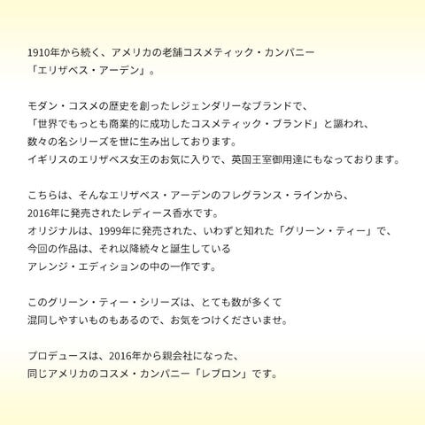 こちらは、そんなエリザベス・アーデンのフレグランス・ラインから、2016年に発売されたレディス香水です。オリジナルは、1999年に発売された、いわずと知れた「グリーン・ティー」で、今回の作品は、それ以降続々と誕生しているアレンジ・エディションのなかの一作です。