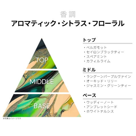 ベルガモット、セイロン・ブラック・ティー、スペアミント、カフィル・ライムなどが、シャープでトランスペアレントなアロマティック・シトラスを香り立たせるトップから、