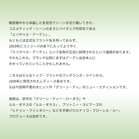 こちらはそんなトップ・ブランドのフレグランス・ラインから、2009年に発売されたレディス香水です。もはや説明不要の大ヒット作「グリーン・ティ」のニュー・エディションです。コスタリカのプルメリアとハイビスカスにインスパイアされてクリエイトしたというこの作品は、おなじみのアロマティック・シトラス・フローラルをよりゴージャスにアレンジした香調となっており、意欲をうかがえる凝った香りに仕上げられております。