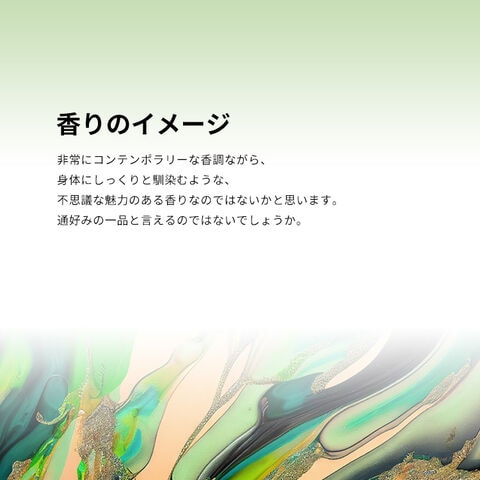 非常にコンテンポラリーな香調ながら、身体にしっくりと馴染むような、不思議な魅力のある香りなのではないかと思います。通好みの一品と言えるのではないでしょうか。洗練されたボトル&パッケージのデザインもエレガントです。