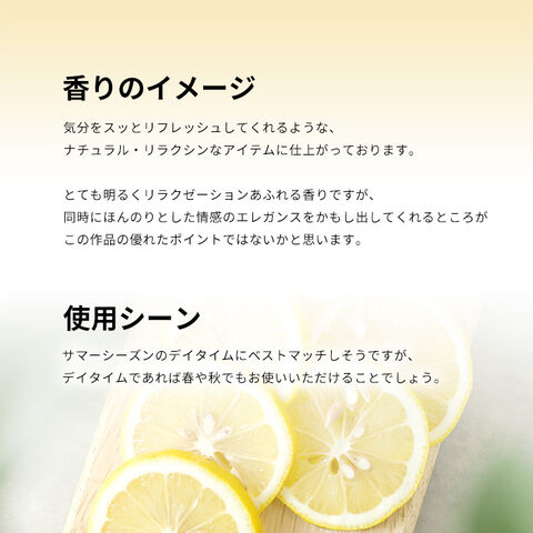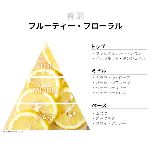 ブラックカラント、ベルガモット、タンジェリン、レモンなどが、すがすがしくエナジャイジングなシトラス・スウィートを香り立たせるトップから、